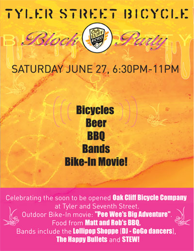 We’re all about block parties at BFOC, and the soon to be opened Oak Cliff Bicycle Company is all the more reason to celebrate. Come out to Tyler and Seventh Street on Saturday, June 27th from 6:30PM to 11PM. We’ll have bicycles, beer, food from Matt & Rob’s BBQ, two bands-The Happy Bullets & STEW!, the Lollipop Shoppe Go-Go Girls and DJ, and end the night with the classic Bike-In Movie…Pee Wee’s Big Adventure!