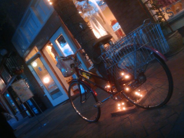 By the time Marie passed, her bicycle was something of a fixture in the district. The girls at Zola’s (Diedra and Annette) talked with her boyfriend and we all agreed to keep the bike as a kind of memorial to Marie. So now whenever Zola’s is open, they put the bike out. It may be decorated for different holidays, or have lights on it at Christmas, but those of us that knew Marie always think of her when we see it, and it’s a good memory. Marie was a kind soul, a gifted artist and a poet and she touched us all.