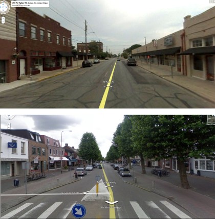 In the 1970’s, Tyler and Polk were converted to One-Way only, as were many other streets in the US. While traffic flowed faster on these routes, business immediately dried up on all retail frontage due to the lack in visibility. Residents also noted increases in potential accidents due to constant wrong-way turns. Fortunately, several property owners throughout the corridor recently noted this degradation of economic development and looked around the country for models like the above to replicate. Another interesting note, the “complete street” shown has greater traffic volumes, yet it’s only two lanes.