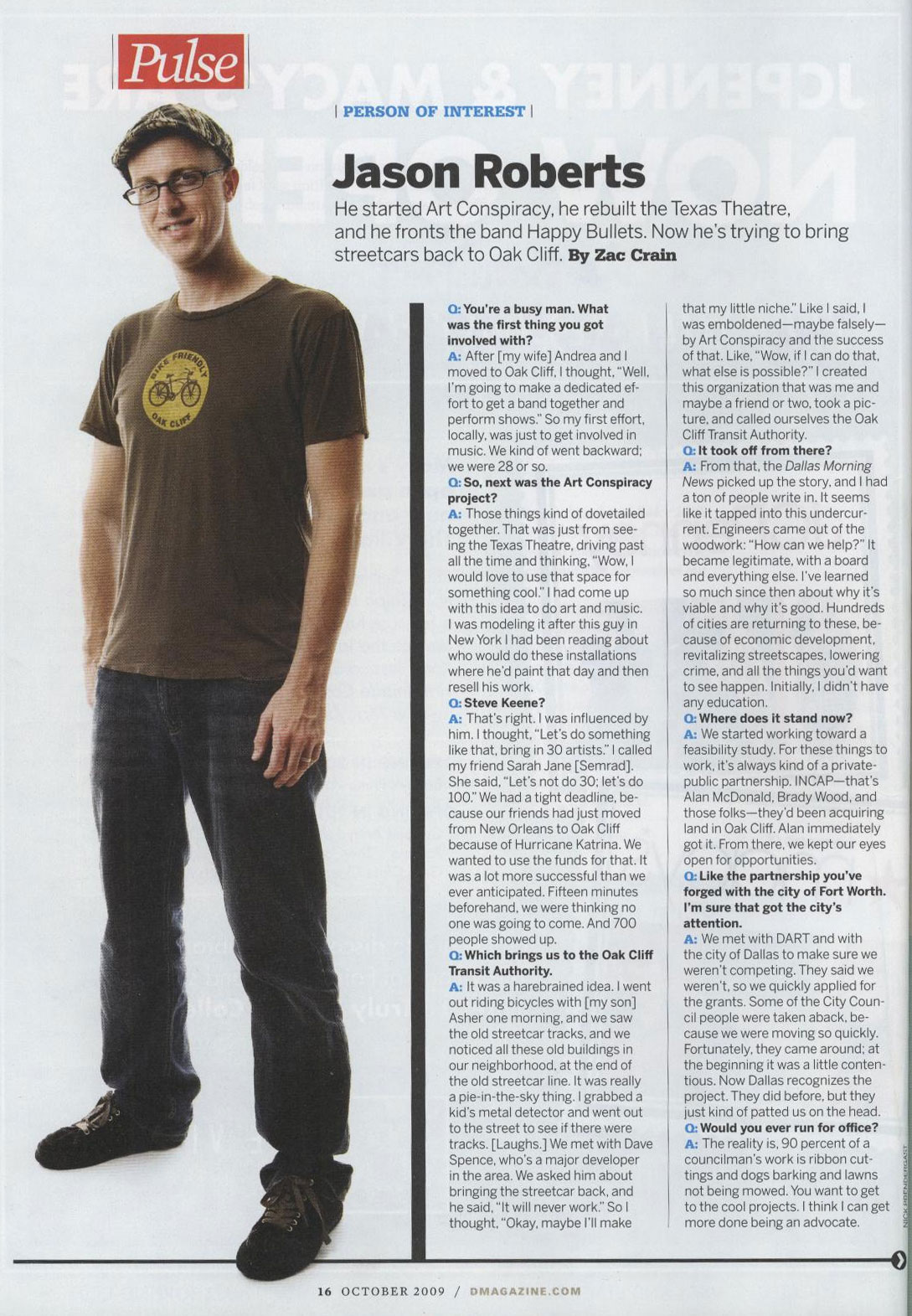 If you happen to be by a news stand this month, be sure to pick up a copy of the October issue of D Magazine. One of our co-founders, Jason Roberts, is spotlighted on page 16, in the “Person of Interest” section. Hooray, Jason!…and sporting a BFOC shirt to boot!