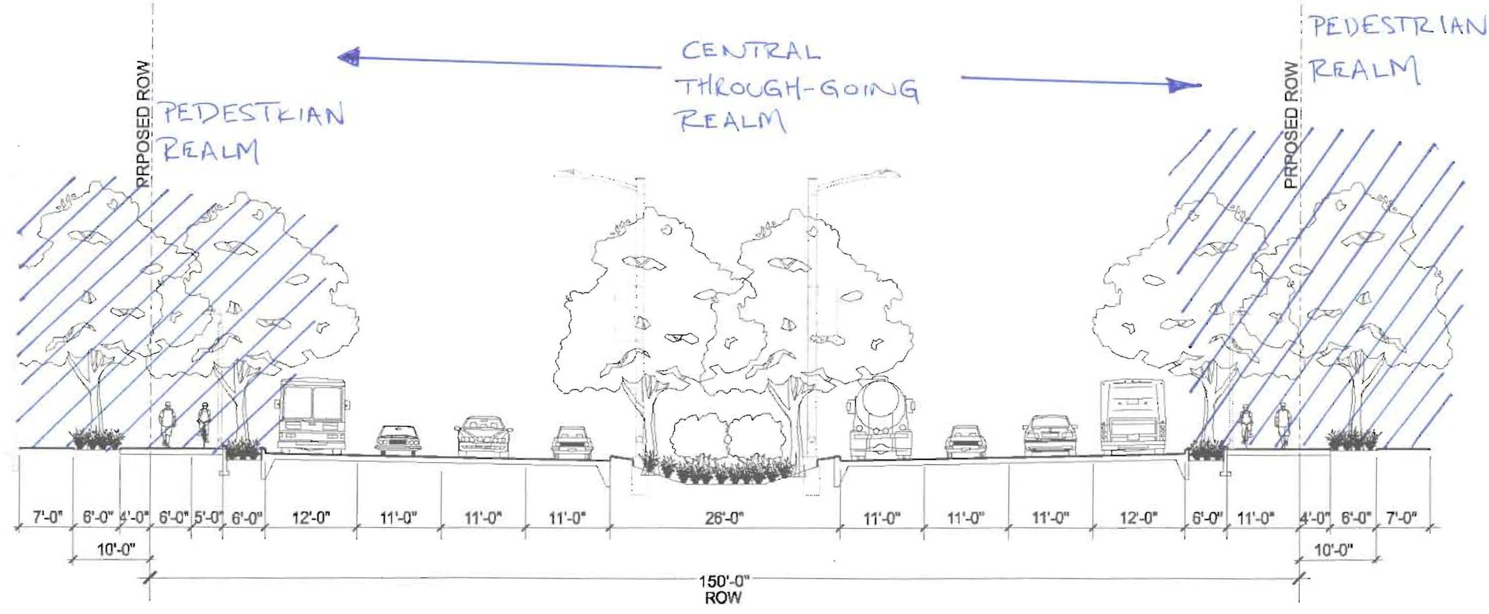 | Boulevard | Pedestrian Realms | Through-Going Realm | Percent of Space for Pedestrian Realms and Urban Activities |