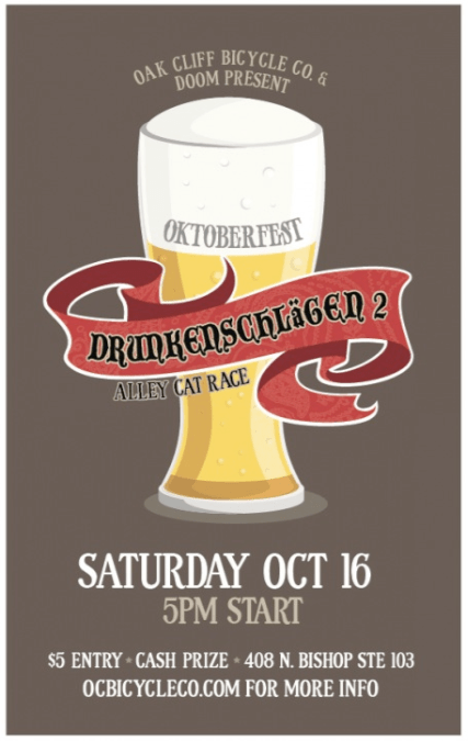 […] October 16 – 8:30 AM – Train to Fort Worth : Bike To Dallas – 1PM – Alley Cat Race Presented by OCBC and DOOM – 6PM – 10PM – Bicycle Block Party in Bishop Arts (w/Beer, BBQ, Bands, Gold Sprints, and […]
