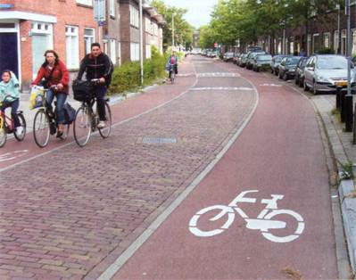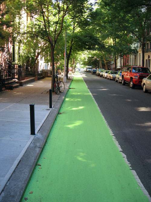 Better: This example shows a bike lane with a physical barrier seperating it from the street. These are beginning to be found on the East and West coasts and some areas in the South. The cost of implementation is slightly higher (though it can be offset by simply moving the parking lane to the left of the bike lane, creating a natural barrier), but the upside is that studies show dramatic increases in bicycling when this option is applied. The physical seperation of cars increases the perception of safety, which is the argument heard most when people say they’d like to bicycle but do not.