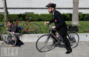 On a side note, it’s wonderful! The larger SLRVs, the cars that were designed for the new line, provide more capacity including better bicycle storage while riding, and level boarding. This may not seem that important to the average cyclist, but if you use the train as part of a bicycle commute, getting on and off without having to lug your bicycle up the flight of stairs is a nice feature. In addition, there are now specific places on the cars where you can hang your bicycle while riding comfortably along in the car. This last point is crucial: If you board a rather full car, your bicycle is vertical now, not horizontal, thus providing more space for non-bicyclist riders and provides them with less opportunity to be annoyed by it!
