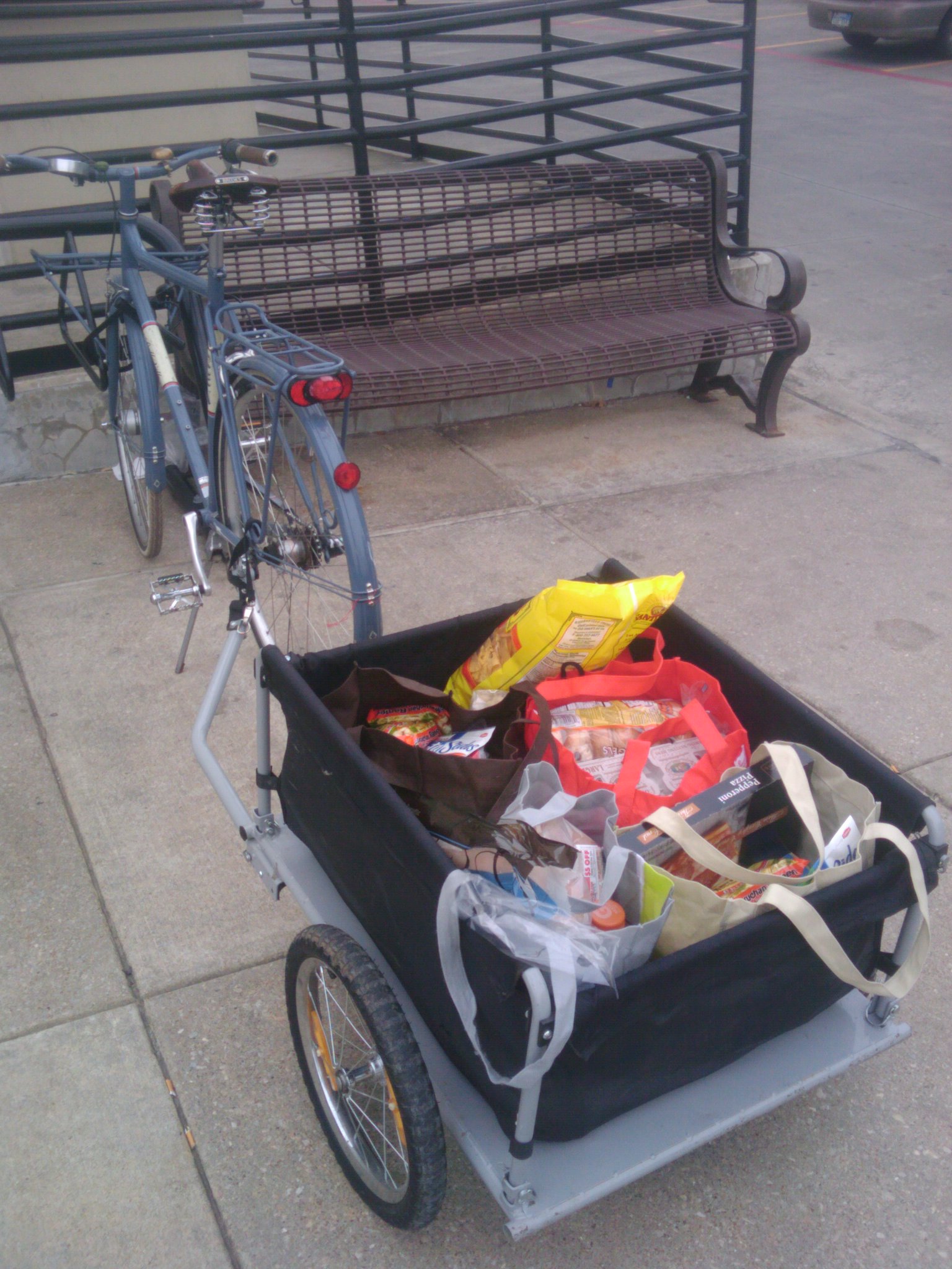 I’ve been using it for close to a year now, and it’s easily paid for itself many times over. When we originally discussed becoming a one-car family in 2009 the greatest obstacle we faced was trying to get groceries. For that alone, the Aosom has performed beyond exception. It’s definitely not a high-end model, but it gets the job done and I’ve found myself using it for regular errands beyond the grocery store. On cold mornings when my daughter is too cold to ride her bike to school, she’ll hop in the trailer with a blanket and a book and relax while I pedicab her in through the car-drop off lane at school. It’s carried everything from industrial ladders, rubbermaid trashcans, and PA systems, to Christmas trees. Highly recommended.