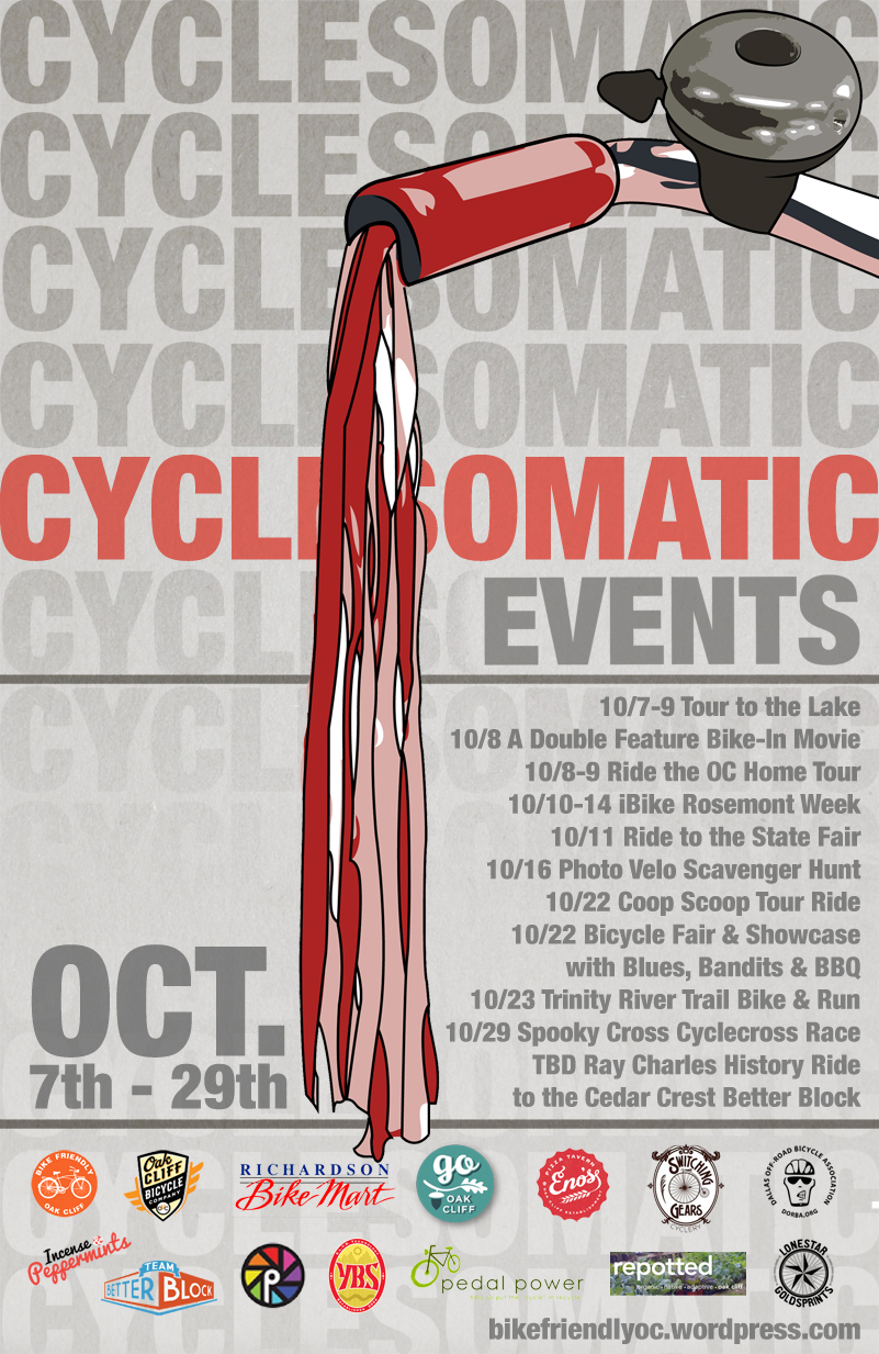 […] Cyclesomatic Bicycle Fair & Showcase this Saturday By turnerwinstonoc bikefriendlyoc.wordpress.com This weekend will be a first for the North Texas bicycling community! Come out to Lake Cliff Park @ 5th St and Crawford in Oak Cliff on October 22nd from 12:00 – 6:00 pm to participate in the Cyclesomatic Bicycle Fair and Showcase sponsored by Richardson Bikemart. […]