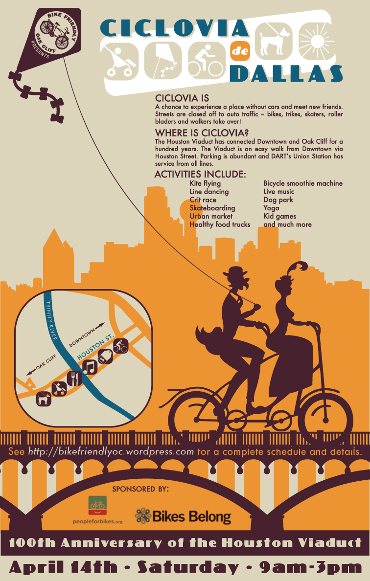 SAVE THE DATE: April 14th, 9:00 AM to 3:00 PM and celebrate the 100th anniversary of the Houston Street Viaduct Bridge and ride, walk, skate in the street WITHOUT ANY car traffic!