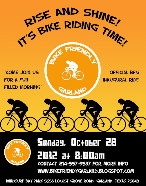 “Join us for a fun morning group ride to kick off Bike Friendly Garland.”Please note: that we will be riding through some roads as we ride through Garland. Rider assumes full responsibility for their actions, safety, injury and personal property. Please evaluate your own physical or health limitations before deciding to participate. We will ride as a group in a “no-drop” style ride at a leisurely pace. We may cover distances of over ten miles. Leave the spandex at home! Thanks.Make sure to follow us on our Facebook page where our event will be listed.