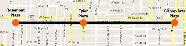 There are a handful of exciting public space projects on the horizon in North Oak Cliff that will soon dot a stretch of Seventh street, creating an inviting pedestrian/bicycle experience that connects neighborhoods to destination points along the corridor with three planned plazas. A Bishop Arts Gateway that will act as the soon to arrive streetcar stop on the East side, Rosemont Plaza which will act as a resident oriented plaza on the West side, and a centralized public square in the center at Tyler street that addresses an extremely dangerous 5-point intersection. This corridor was the former streetcar line which ran parallel to Davis street and created a natural pathway from the neighborhoods to the commercial corridors along Seventh street.