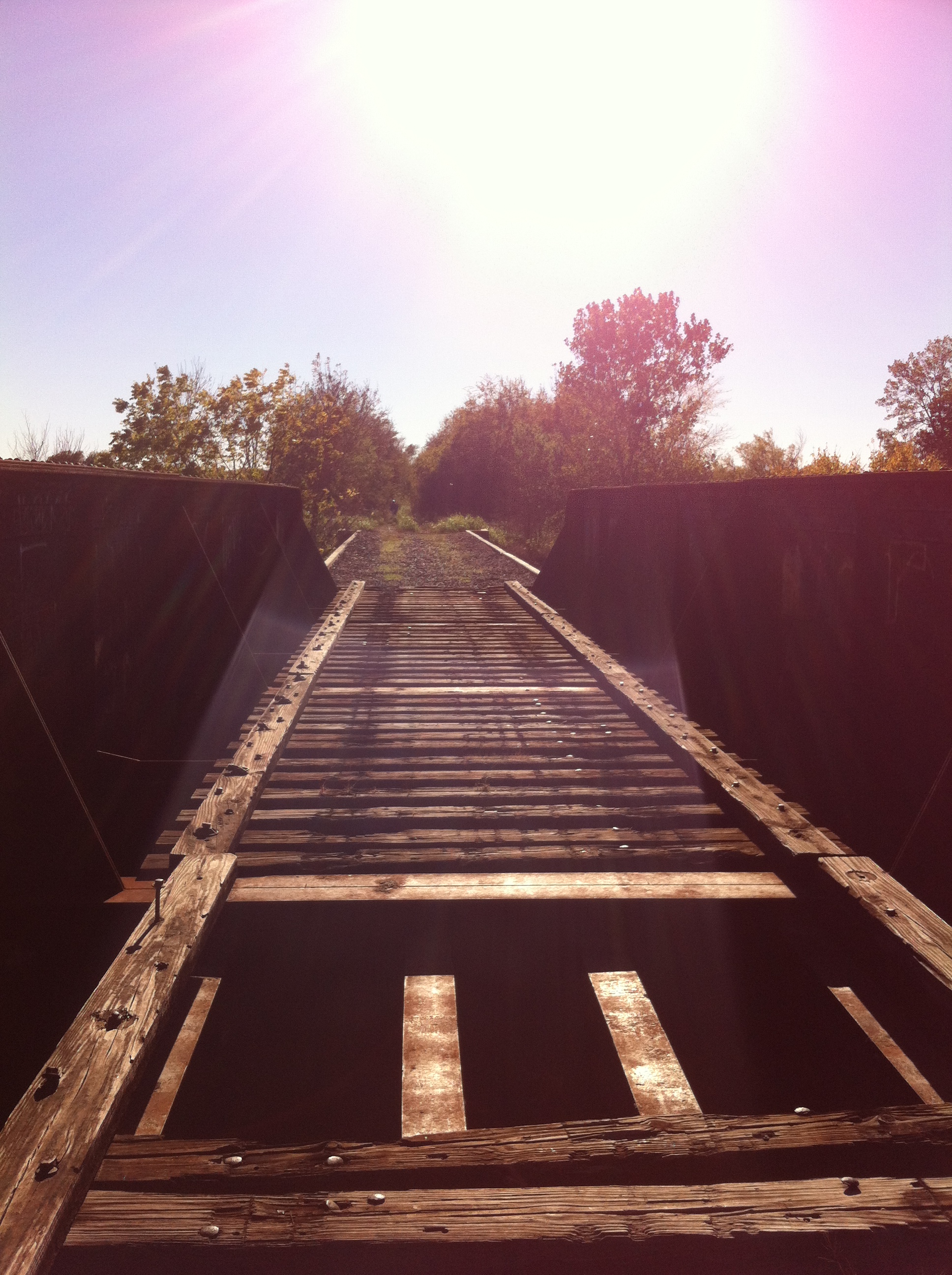 I suspect that the NETT group will focus on repairing and making these bridges safe and ride able in the near future. However, one in particular made me stop and remember that I’m afraid of heights, before I did a tight rope like walk across a 6 foot gaping hole. This particular bridge crosses the Sulphur river, one of the main tributaries in North East Texas. The bridge lies between Pecan Gap and Franklin, a designated un-passable section of the trail per the NETT group. Anyway, the section you see in the following picture is the gap in the Sulphur bridge crossing.