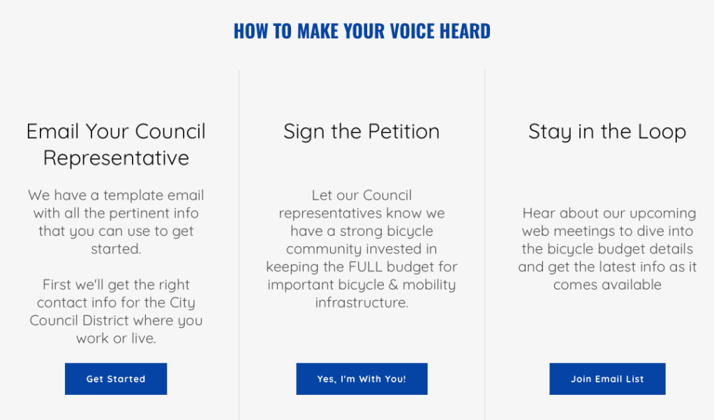The City is setting its budget now and our Council Representatives are hosting virtual town hall meetings for input throughout August. (The new fiscal year starts Oct 1.) Now is our chance to have an impact on the conversation – and we all now funding for bike infrastructure is desperately needed.