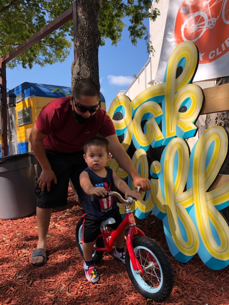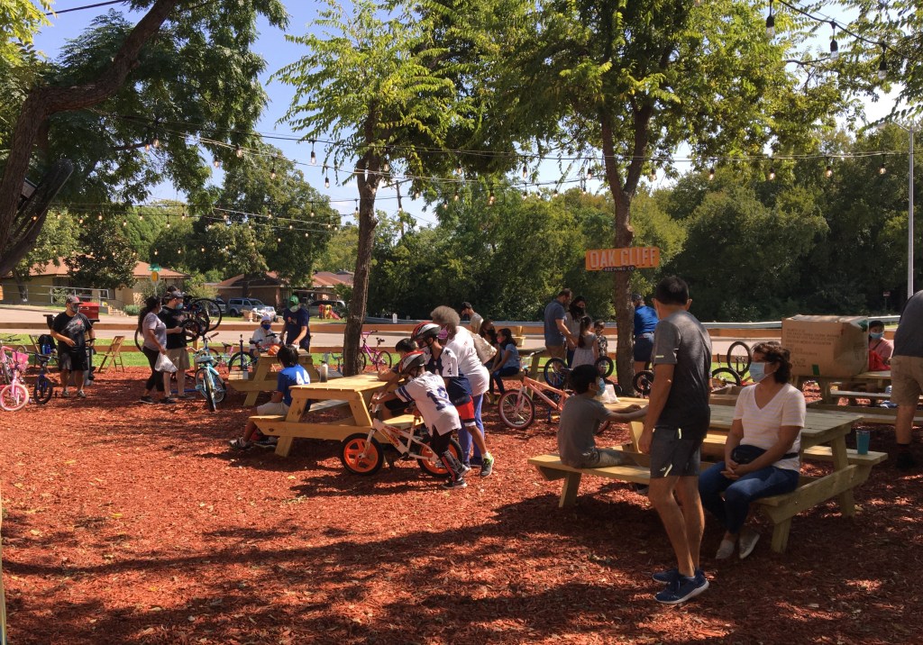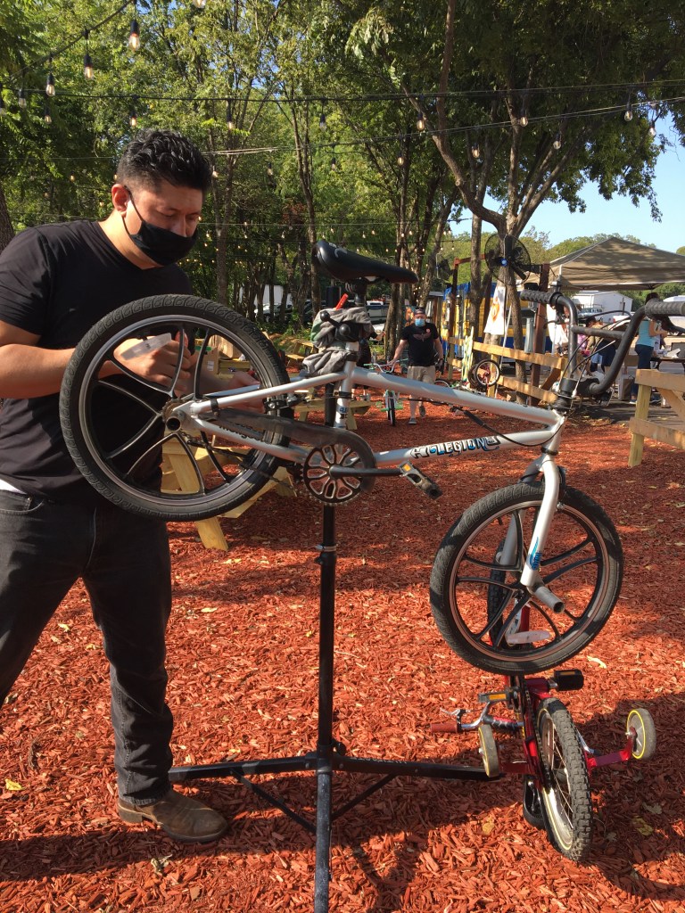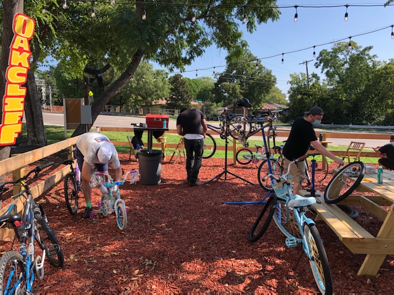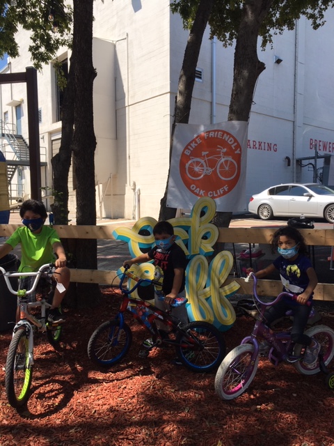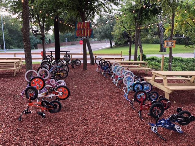 Last Saturday Bike Friendly Oak Cliff volunteers hosted a refurbished niños bike giveaway and quick-fix bike repair event for the Oak Cliff community. Held at Oak Cliff Brewing at Tyler Station in the outdoor biergarten, families began to line up at 8:30am for the event scheduled 10am-3pm.