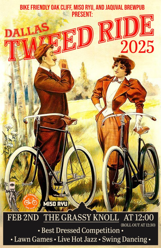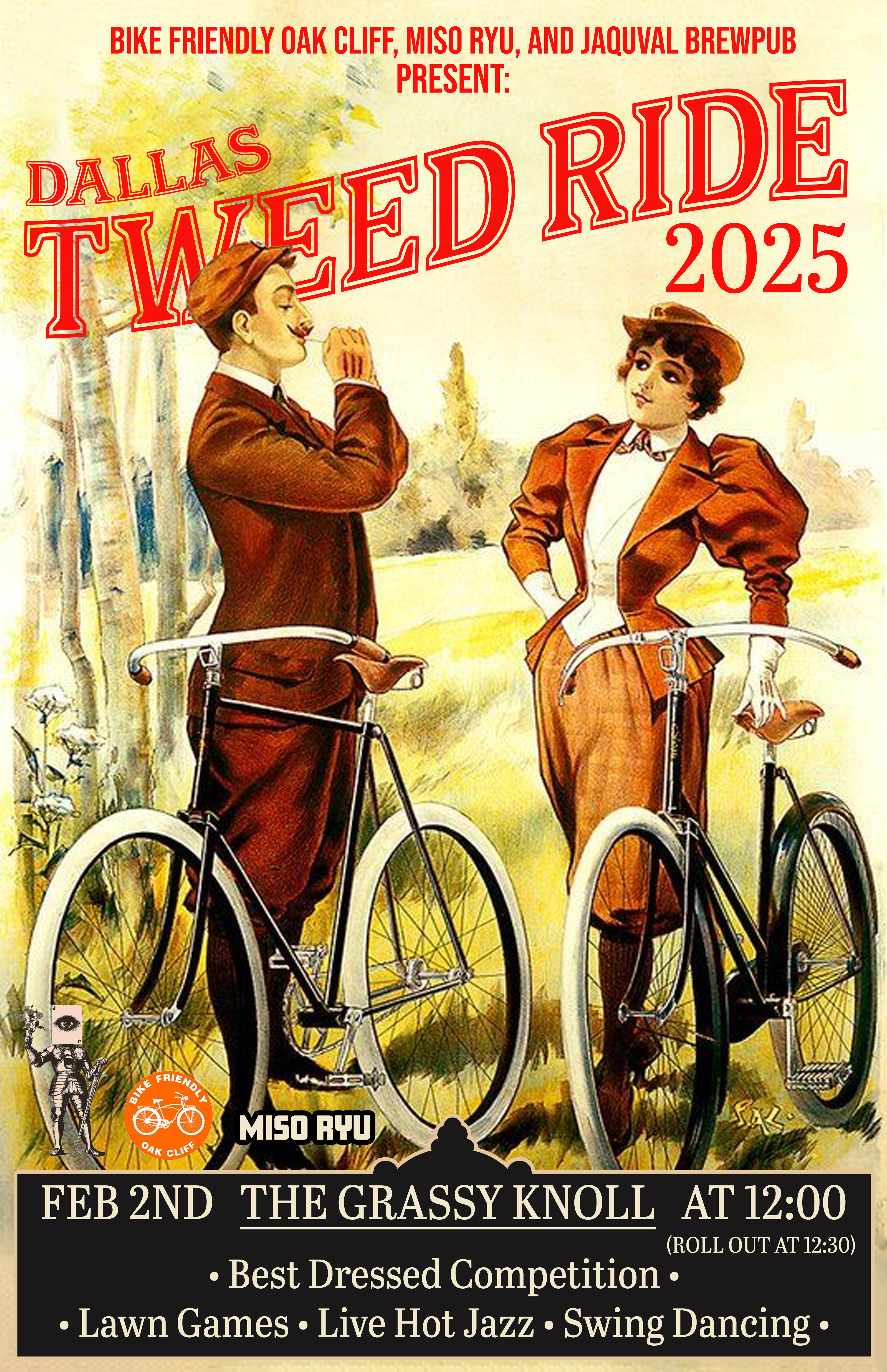 ‘Ello Guvnor! BFOC along with Miso Ryu and Jaquval Brewery are getting all dressed up once again for the 2025 Dallas Tweed Ride on Sunday, February 2nd. We’ll meet at the Grassy Knoll in Downtown Dallas at 12PM, rolling out at 12:30PM and ride through downtown, then cross the Houston bridge over to the Bishop Arts District where we’ll have lawn games setup in front of Jaquval Brewpub. We’ll also have live music and swing dancing for the afternoon! The Facebook event is here.